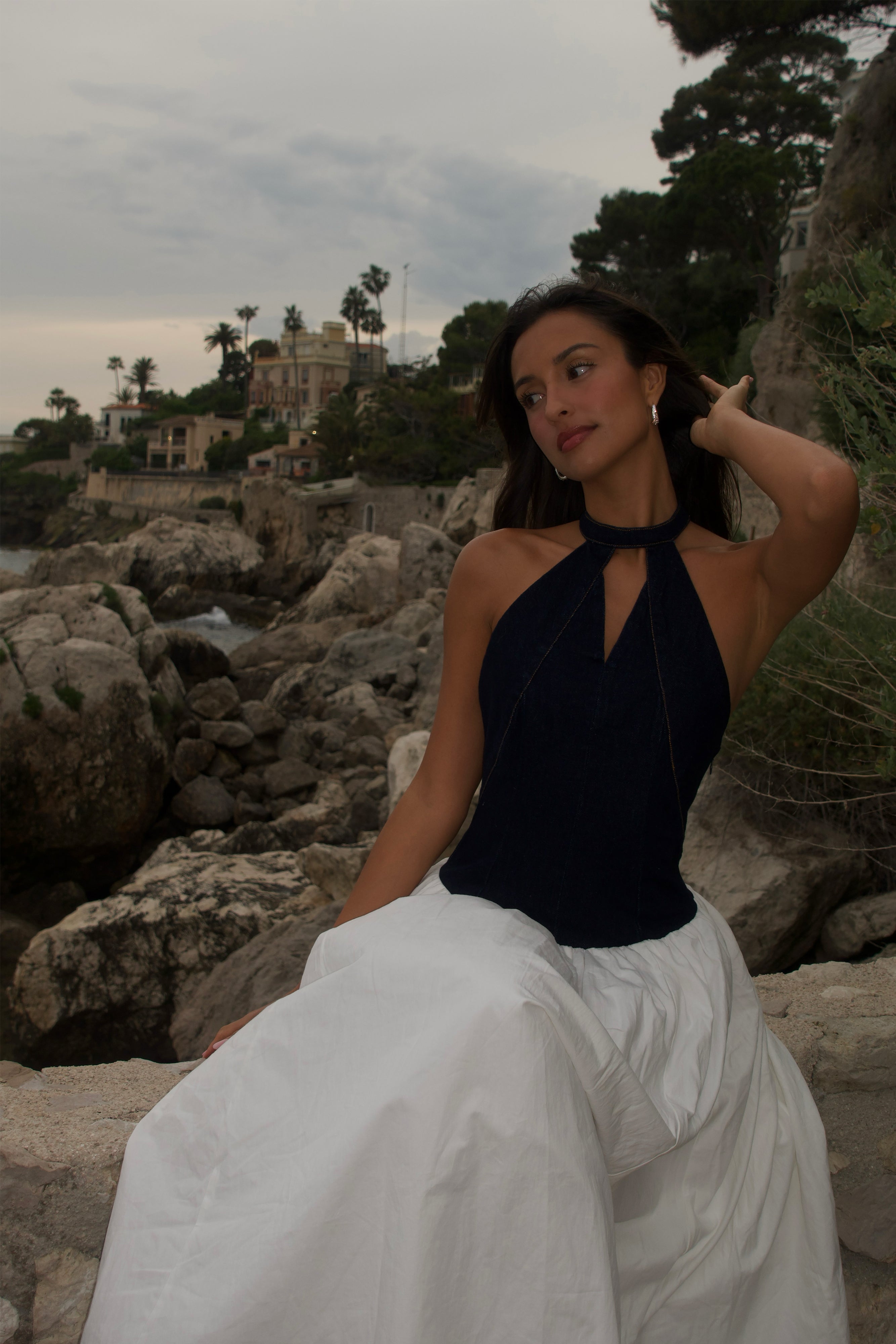 The ASHWIN Denim Cotton Midi Dress is a modern blend of bold structure and soft movement. Featuring a halter neckline with a secure back button closure, this standout silhouette pairs a fitted denim bodice with a crisp contrast cotton skirt. A front cutout detail and drop waist add a touch of edge, while the midi length offers balance and elegance. Finished with a side zip and full lining for a smooth fit, this dress is perfect for day-to-night styling, city exploring, or elevated summer occasions.